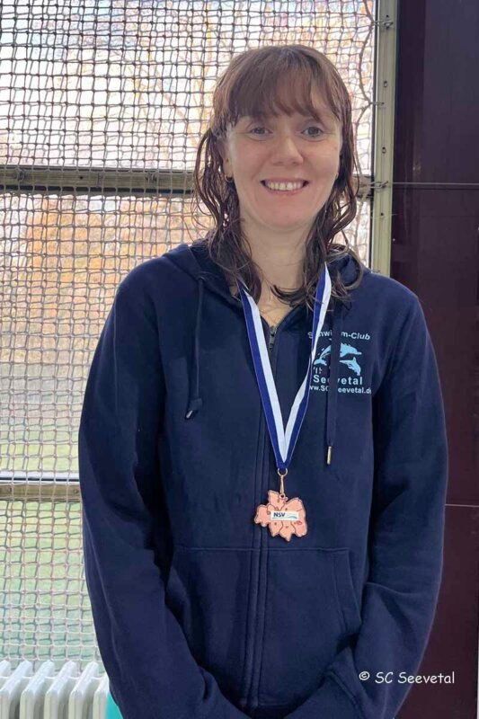 Johanna hatte am Sonnabend und Sonntag jeweils drei Starts. Zweimal kam sie aufs Treppchen. Über 100R und 200R schwamm sie zu Gold und wurde Norddeutsche Mastersmeisterin 2026 in der AK35.